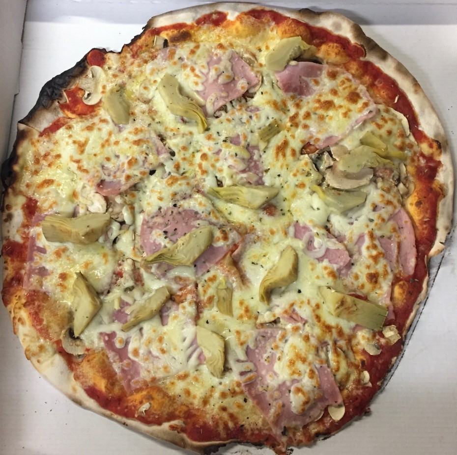 Sauce tomate, fromage, champignons, jambon, coeur d'artichauts et origan