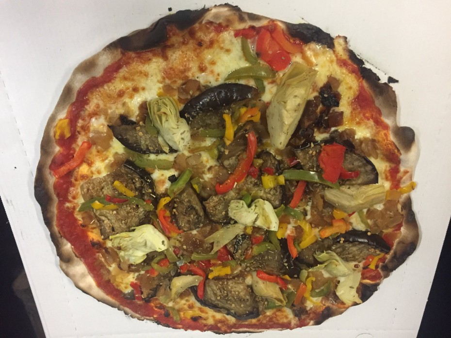Sauce tomate, fromage, aubergines, coeurs d'artichauts, poivrons, oignons cuits et origan