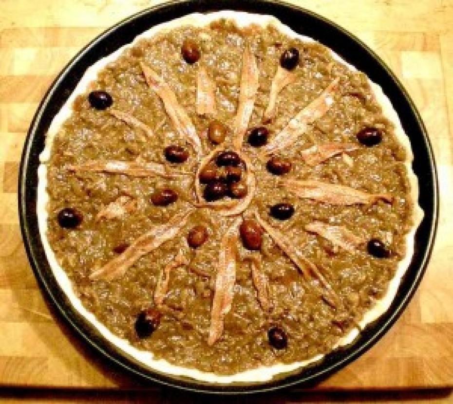 Oignons cuits, anchois, olives et origan