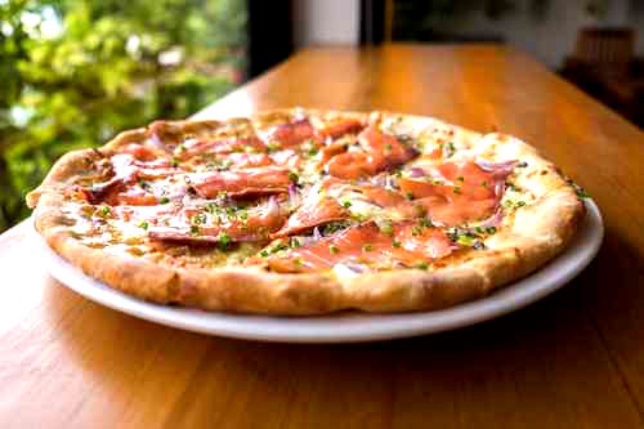 Sauce tomate, fromage, saumon fumé, crème fraîche, jus de citron et origan