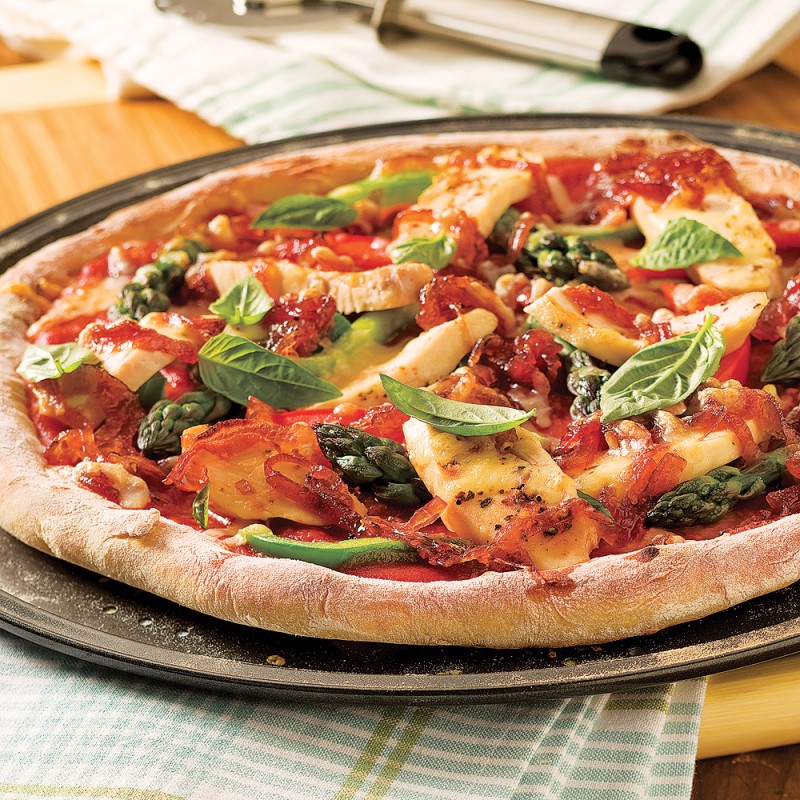 Sauce tomate, fromage, champignons, poulet, poivrons, oeuf, olives vertes et origan
