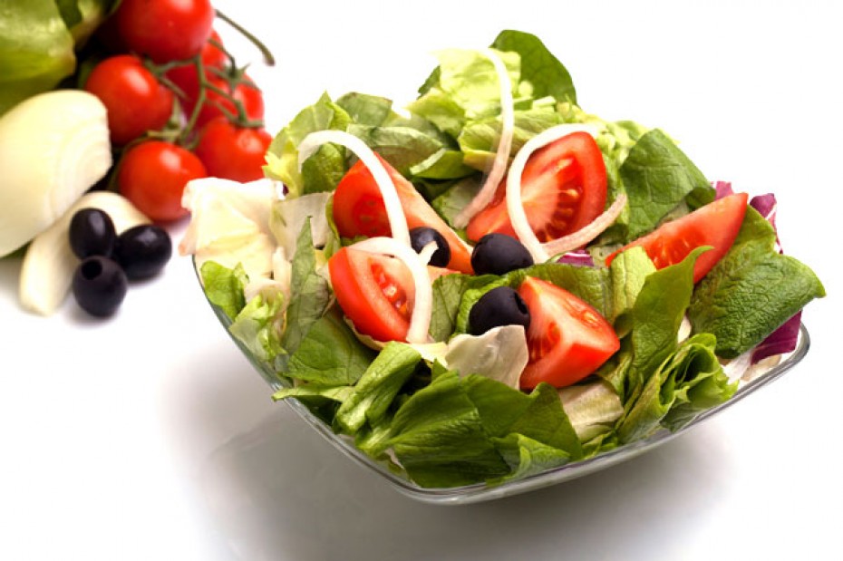 Mesclun, tomates, oignons blancs, olives noires